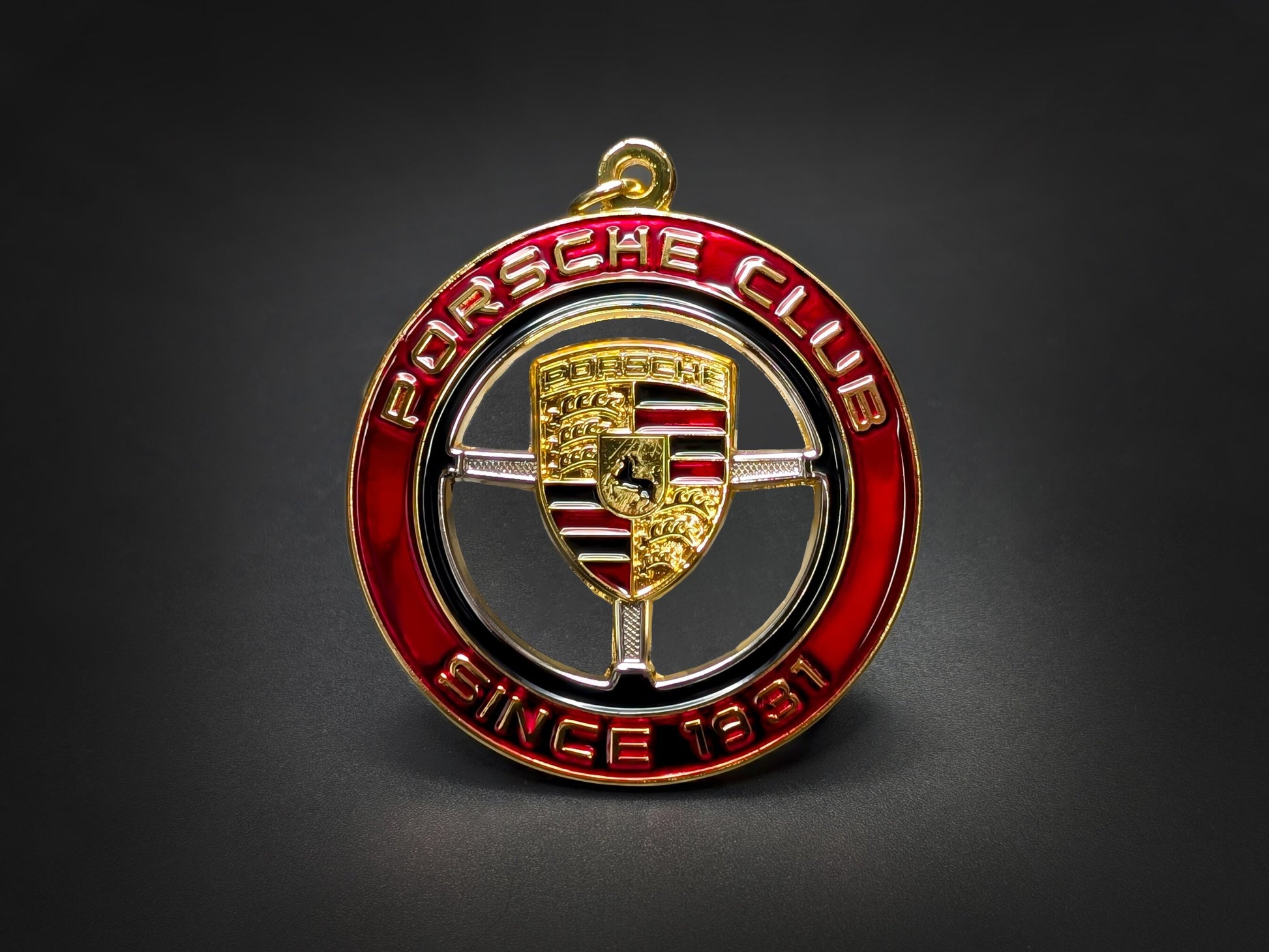 This metal keychain captures the prestige of Stuttgart with a detailed Porsche Club commemorative design. Crafted with a premium gold finish and high-gloss enamel, this accessory is a sophisticated tribute to nearly a century of automotive excellence.